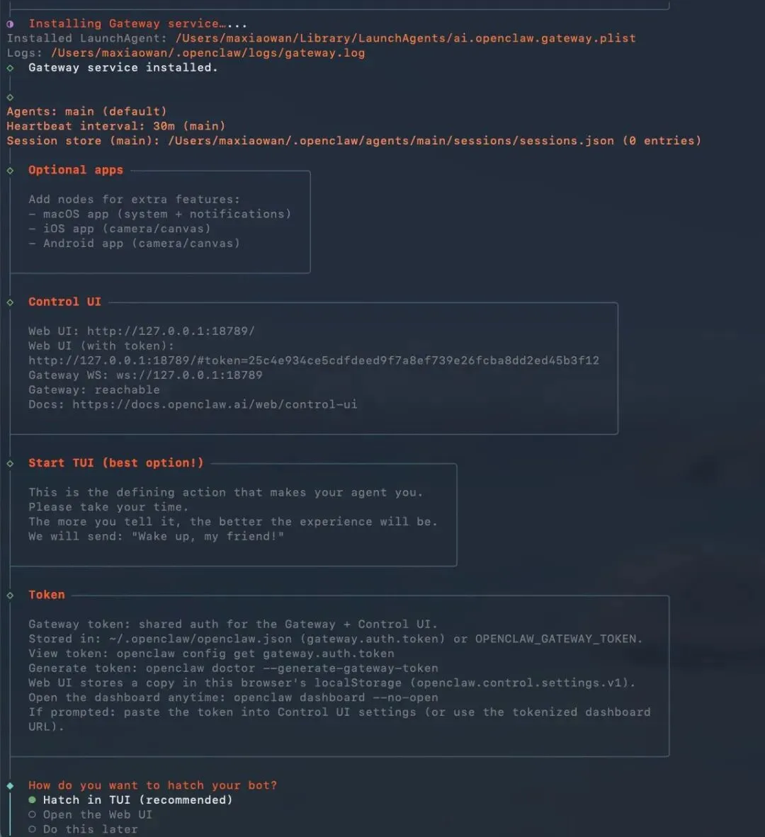 • TUI:也就是终端界面,适合本来就习惯在命令行里工作的开发者• Web UI:浏览器界面,访问地址通常是http://127.0.0.1:18789/