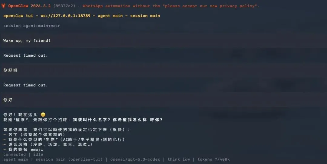 当上面的流程全部走完后,OpenClaw 会真正进入对话状态。这时你可以随便输入一句简单的问题,测试一下当前配置是否已经打通。