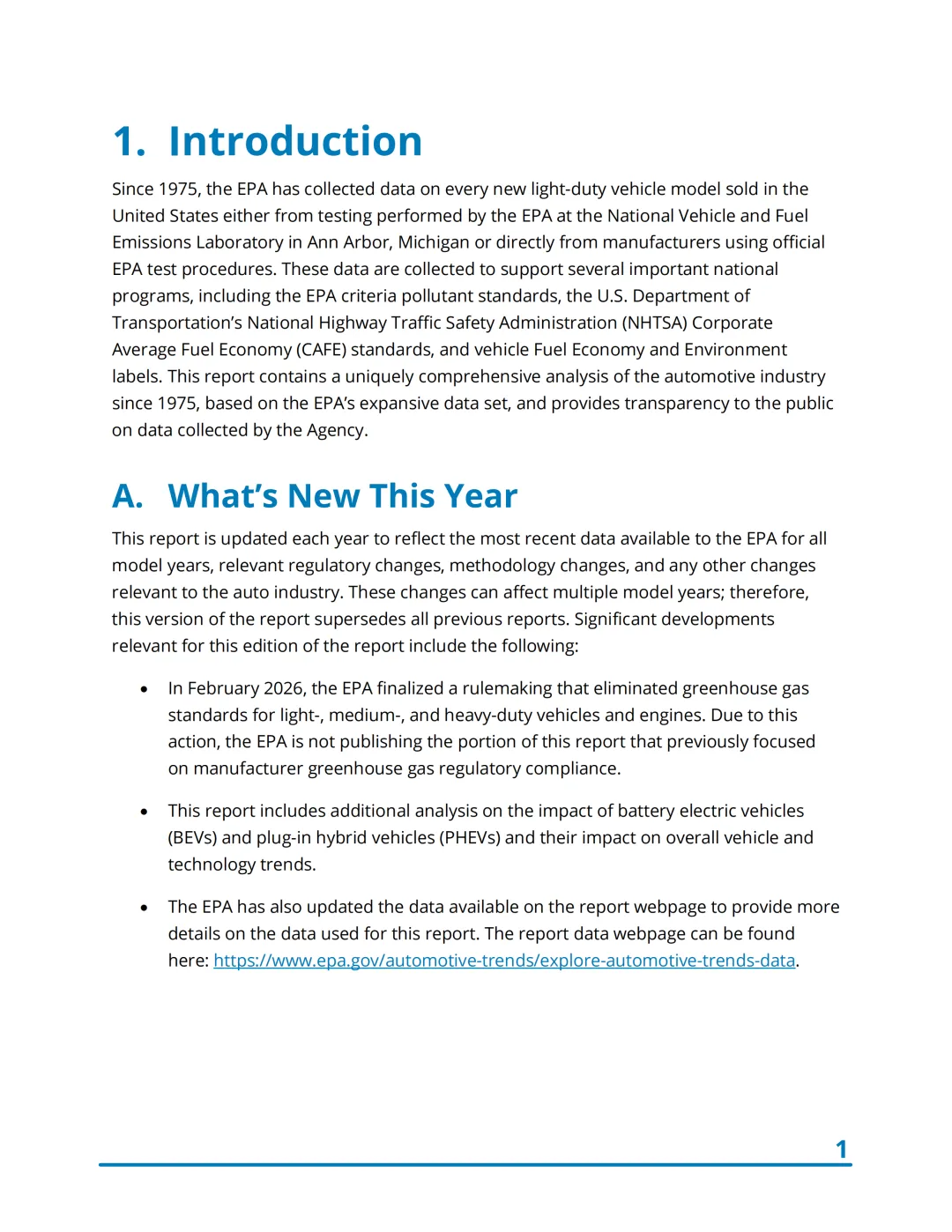 这份由美国环境保护署(EPA)于2026年2月发布的《2025年版汽车趋势报告》,基于自1975年起的、覆盖美国市场所有轻型车的详尽数据,对汽车行业的燃油经济性、技术及市场趋势进行了权威且深入的分析。以下是对报告核心内容的深度解读与分析: