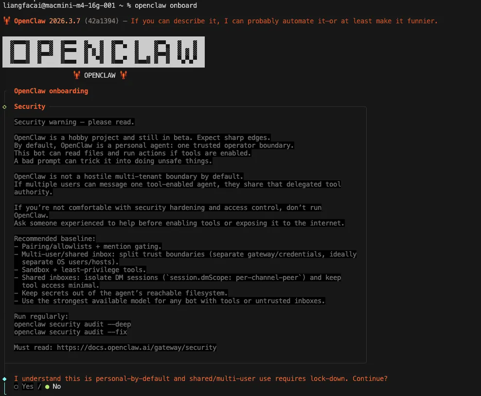 使用 OpenClaw 可能存在一些风险,是否继续?