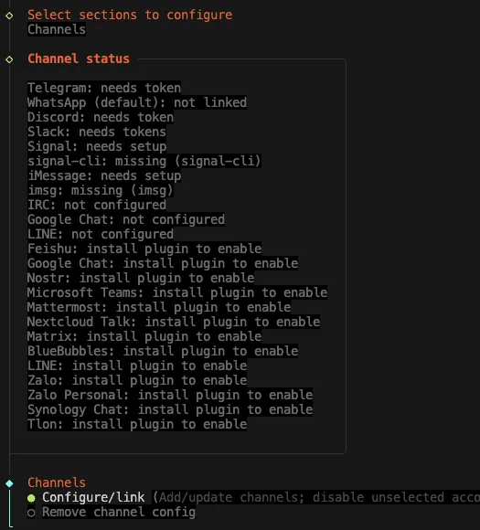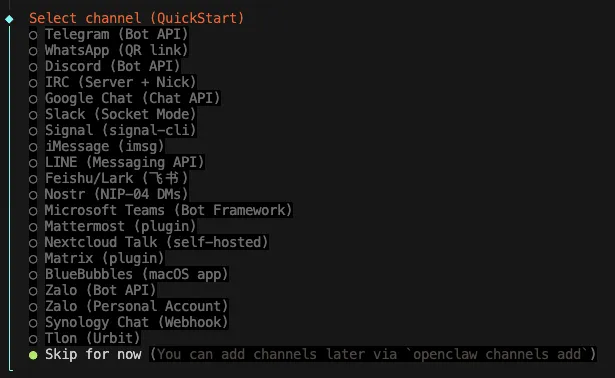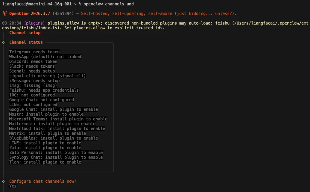 然后执行 openclaw channels add