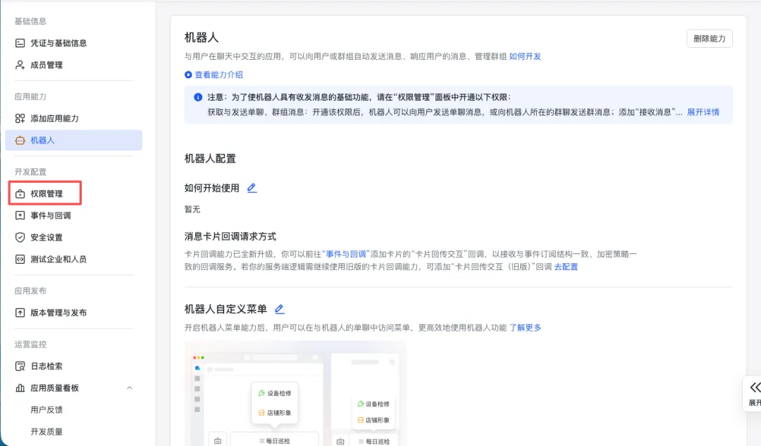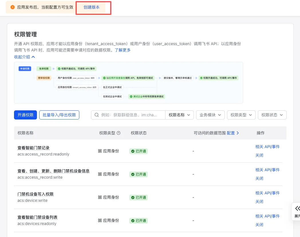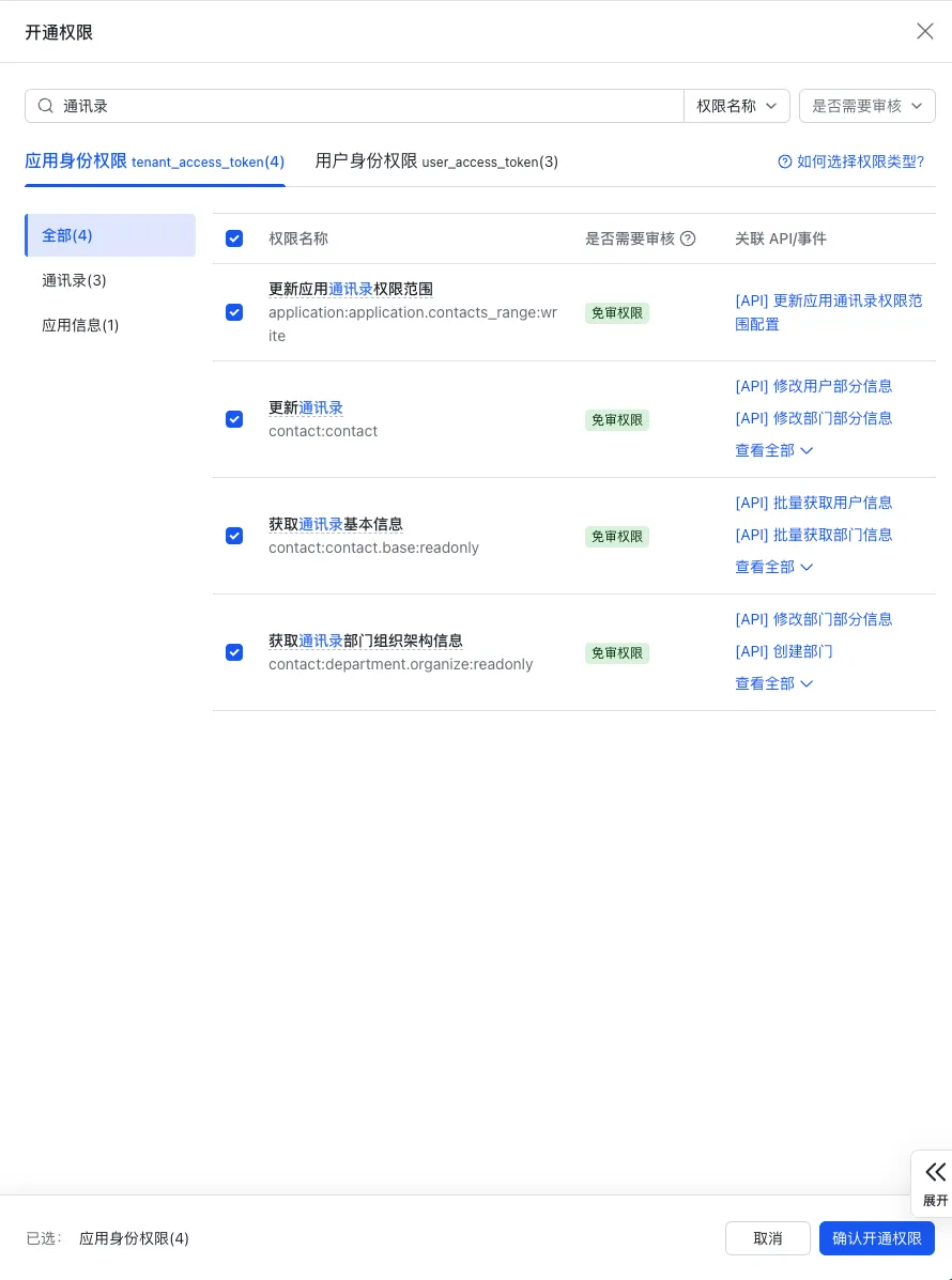 开发配置 → 权限管理 → 开通权限在搜索框输入: