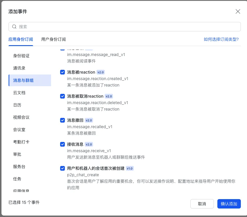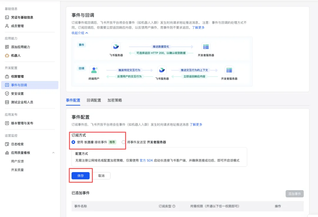 订阅方式 → 使用长连接接收事件点击保存。