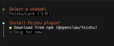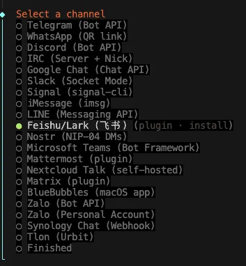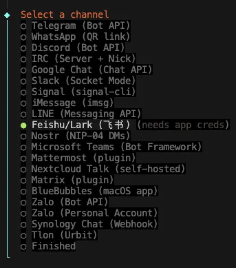 openclaw channels add然后依次选择飞书
