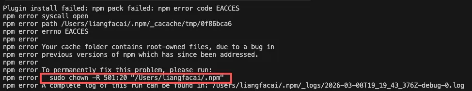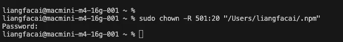 sudo chown -R 501:20 "/Users/liangfacai/.npm"注意,文件夹路径要改为你自己的