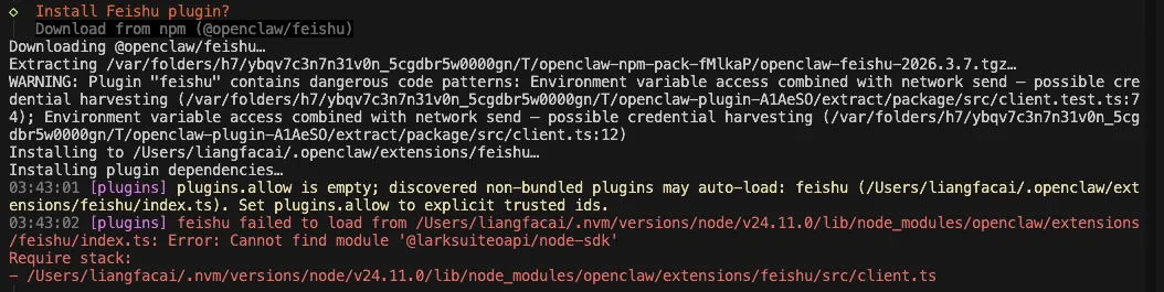 rm -rf ~/.nvm/versions/node/v24.11.0/lib/node_modules/openclaw/extensions/feishurm -rf ~/.openclaw/extensions/feishuopenclaw plugins install @openclaw/feishu