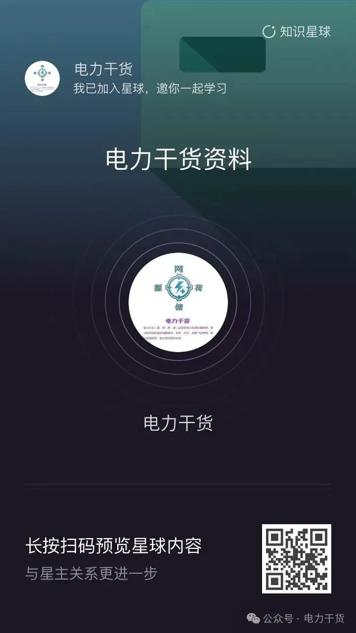 关于电力干货发布资料的共享与下载电力干货致力于电力科技创新,电力行业(源、网、荷、储)全系统电气检测仪器研发生产,电力科技创新项目课题研究开发。公众号所有发布的资料是团队在相关科技项目开发的过程中收集参考学习借鉴的资料,共享发布出来供大家学习参考借鉴,共同推进电力技术进步,保障电力安全高效运行;由于资料多(包括相关论文、电子书、报告资料,研究方案,可研报告,评审验收资料等等),专业广(涉及源、网、荷、储、发、输、变、配、以及工程建设、设备维护、系统巡检等等),多学科交叉,小团队人力有限,整理资料能力不足。为方便大家自行查找下载,目前已将部分资料共享在知识星球,可扫码查看详情。部分涉及密级的项目资料会在解密期截止日之后陆续发布。后续资料会不定期上传,欢迎共享您的资料(直接发送文件到公众号对话里即可,如果有哪些您需要的资料还没在知识星球上传的请在公众号对话里留言。)。