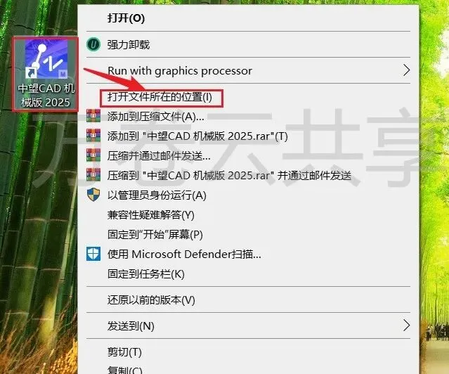 10.鼠标右击→桌面中望CAD机械版2025简体,选择→打开文件所在的位置
