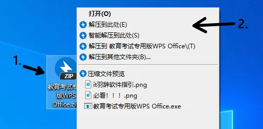 1.点击wps压缩包,2.右键解压
