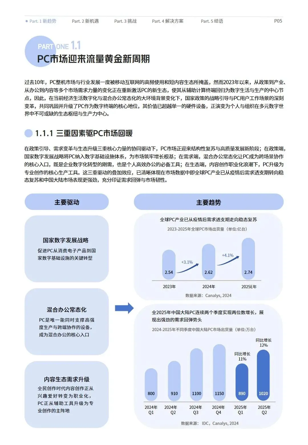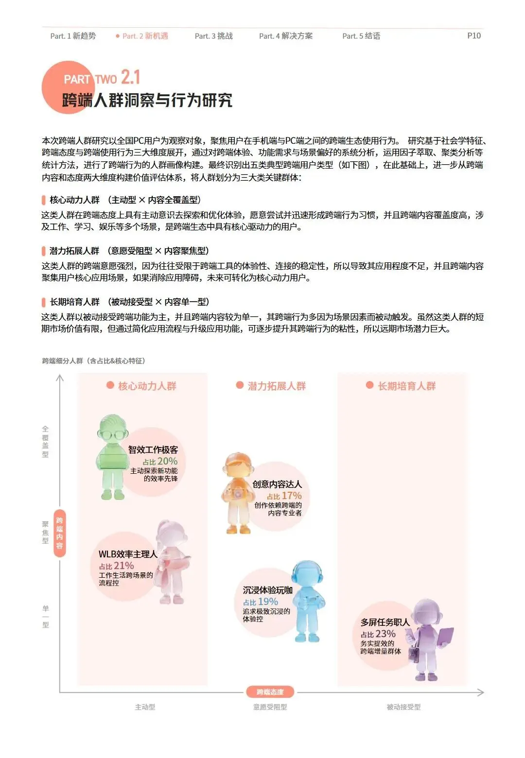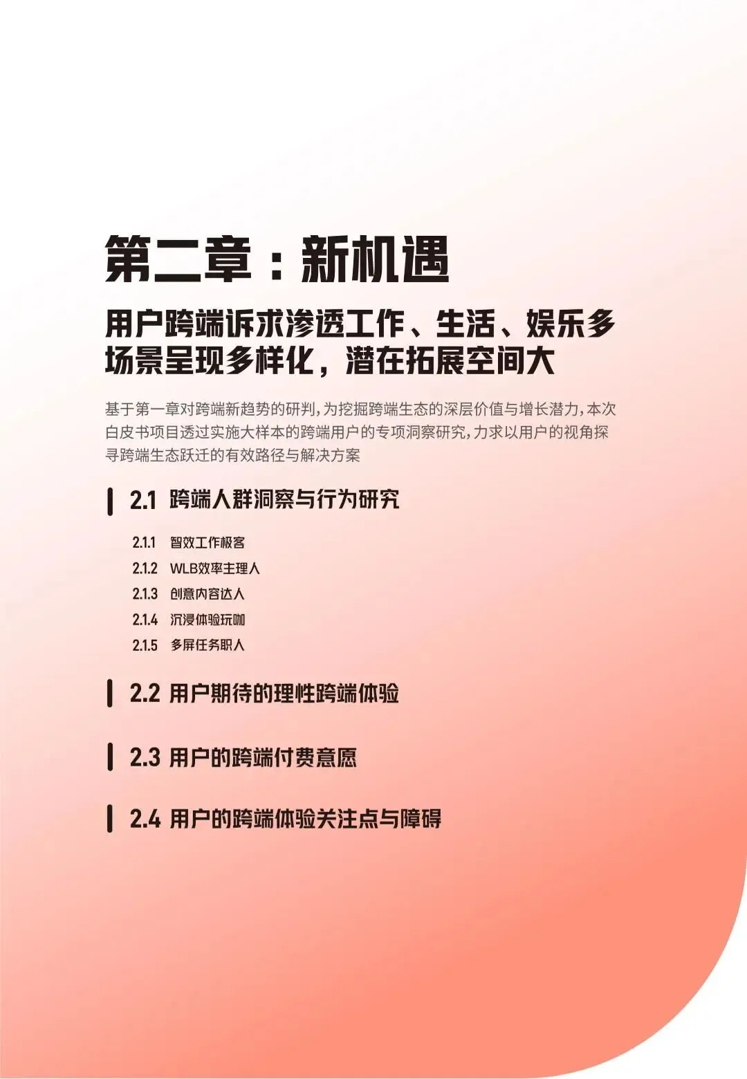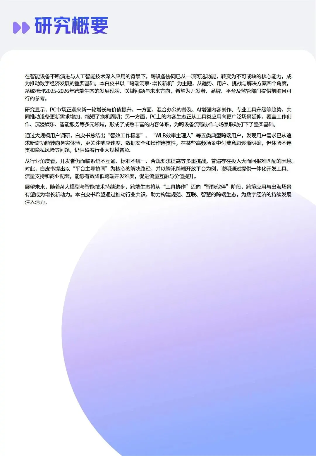 数字技术与人工智能的快速发展,推动智能终端设备边界持续消融,跨端生态成为数字经济发展的重要方向。PC市场在政策引导、混合办公常态化与内容生态升级的三重驱动下迎来复苏,AI PC的渗透率快速提升,硬件高端化、智能化趋势凸显,PC正重新回归数字生活与生产的核心节点。与此同时,用户对跨端体验的需求从单一功能延伸至全场景无缝协同,工作、娱乐、生活等场景的跨端融合已成必然,不同类型用户展现出差异化的跨端行为与诉求,但体验割裂、隐私安全等问题仍制约行业发展。开发者虽将跨端视为新增量突破口,却面临生态壁垒、体验一致性难保障、合规风险等多重挑战。在此背景下,科技企业纷纷布局跨端解决方案,通过技术协同、生态开放构建跨端能力,政策层面也持续完善数据安全治理体系,为跨端生态发展保驾护航。本报告系统梳理2025-2026年跨端生态发展现状、用户需求、行业挑战,提出针对性解决方案与未来发展方向,为产业各方提供参考。