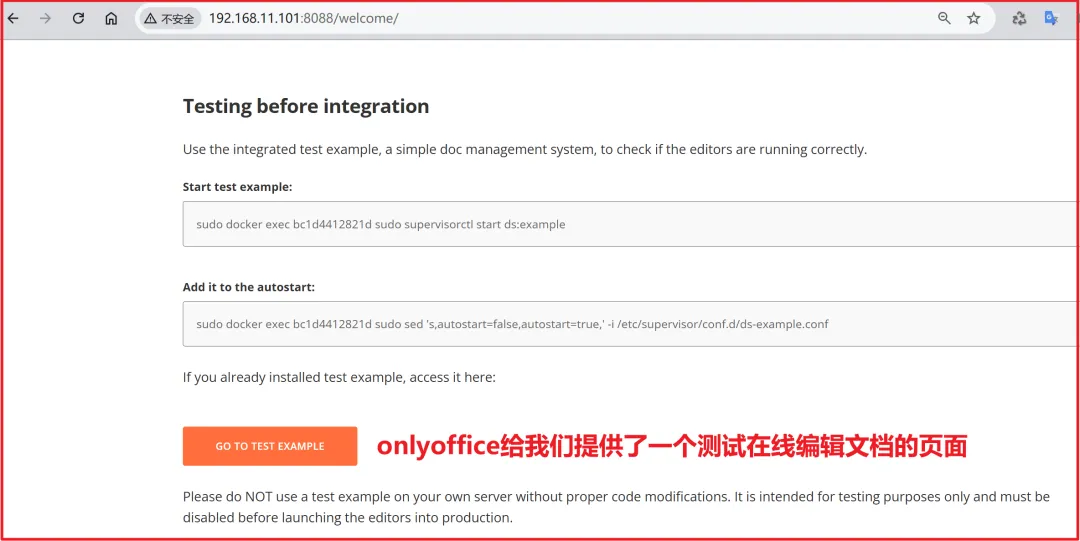 启动之后访问onlyoffice提供的页面,如下:如果此时点击 GO TO TEST EXAMPLE 会报如下错误这是因为测试服务没有启动,上图中给我们提供了启动命令,分别在服务器上执行如下两条命令(注意:容器id修改成自己的启动的服务id):启动测试服务:sudo docker exec bc1d4412821d sudo supervisorctl start ds:example设置测试服务自动启动sudo docker exec bc1d4412821d sudo sed 's,autostart=false,autostart=true,' -i /etc/supervisor/conf.d/ds-example.conf