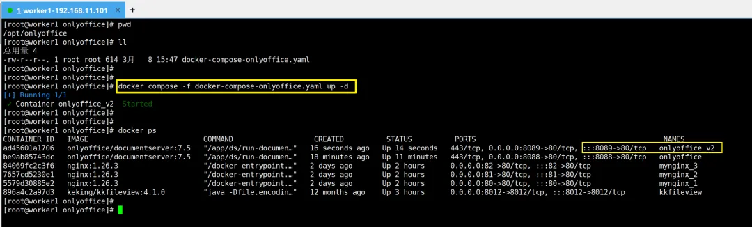 生产环境通常使用docker-compose的方式进行启动服务,把上述的docker run方式的命令转换成如下的docker-compose命令(docker-compose-onlyoffice.yaml):注意:上面启动的onlyoffice服务已经占用了宿主机的8088端口,现在通过docker-compose方式启动时使用8089端口,容器名称也换成onlyoffice_v2name: onlyofficeservices: onlyoffice: image: onlyoffice/documentserver:7.5 container_name: onlyoffice_v2 ports: - "8089:80" environment: - JWT_ENABLED=false - WOPI_ENABLED=false volumes: - /opt/docker_mount/onlyoffice/DocumentServer/logs:/var/log/onlyoffice - /opt/docker_mount/onlyoffice/DocumentServer/data:/var/www/onlyoffice/Data - /opt/docker_mount/onlyoffice/DocumentServer/lib:/var/lib/onlyoffice - onlyoffice_config:/etc/onlyoffice/documentserver restart: alwaysvolumes: onlyoffice_config: external: true
