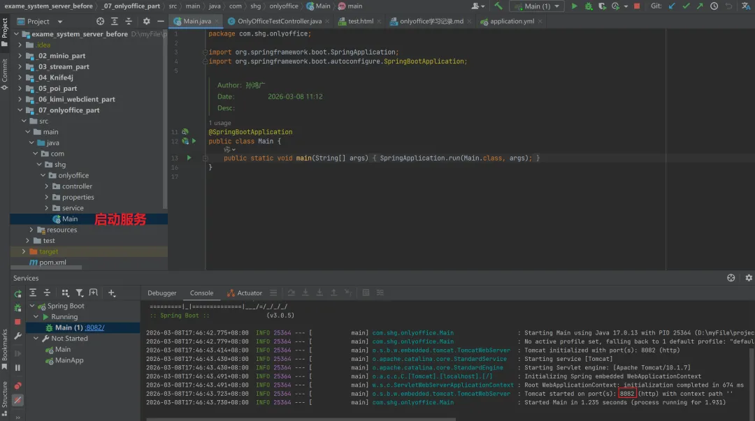 进入到docker-compose-onlyoffice.yaml 文件所在目录下,执行如下命令启动onlyoffice服务:3. SpringBoot项目集成onlyoffice请参考链接https://gitee.com/sun_hongguang/exame_system_server_before/请看 <_07_onlyoffice_part> 这个Module下的代码注意:resources/static/test.html这个文件里面的两个ip地址要修改成你自己的,然后浏览器访问http://你的本地ip:端口/test.html