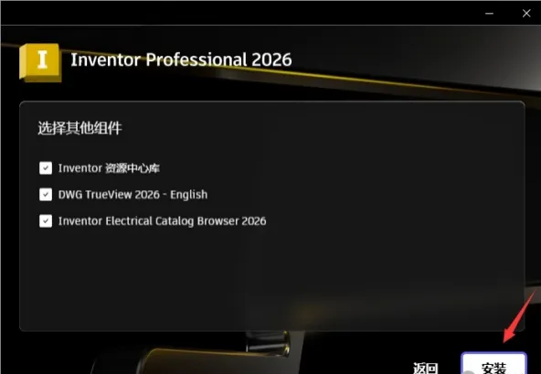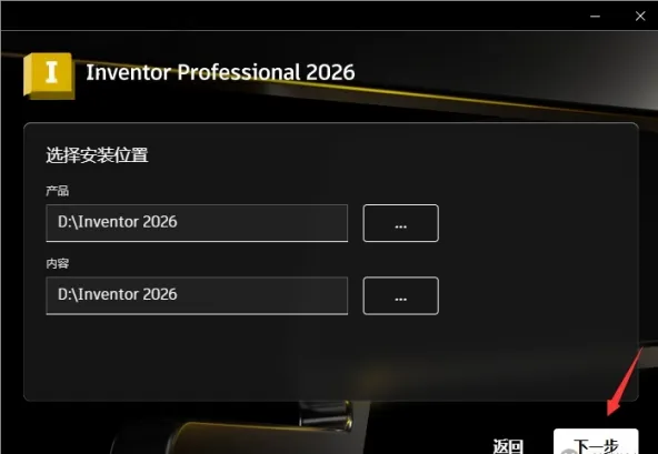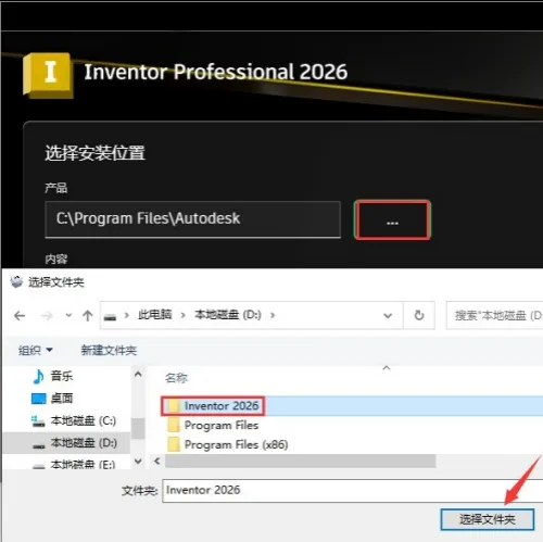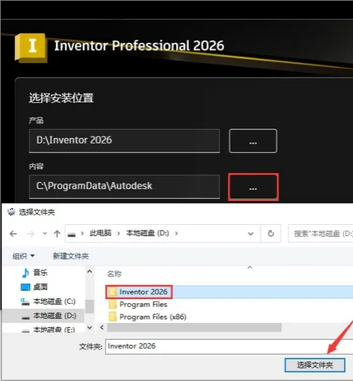 6.点击【…】选择内容安装位置,选中步骤5新建的“Inventor 2026”文件夹。