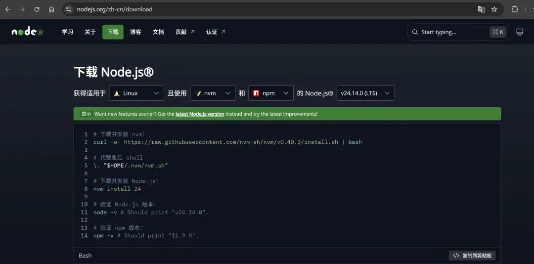 curl -o- https://raw.githubusercontent.com/nvm-sh/nvm/v0.40.3/install.sh | bash如果网络连接不上github,可以找一下有没有镜像源,或者直接上魔法。