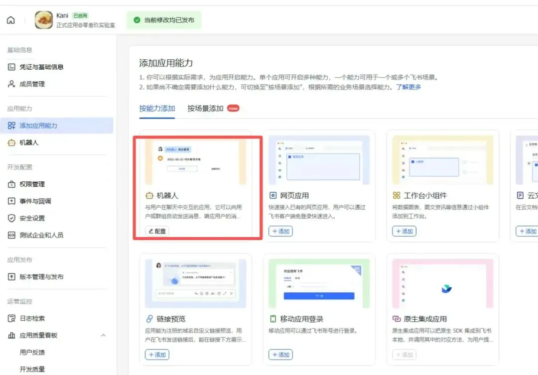 3. 添加应用能力,找到机器人并配置