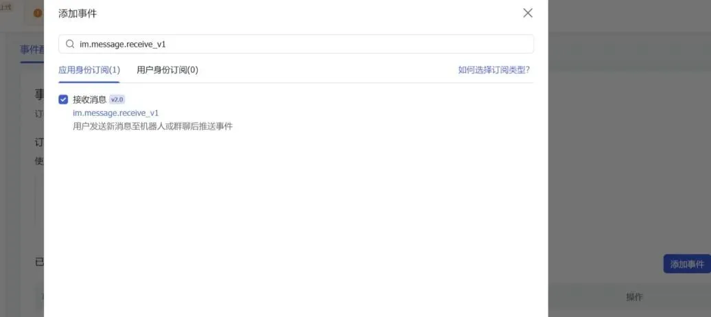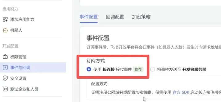 4. 找到事件与回调,选择长连接