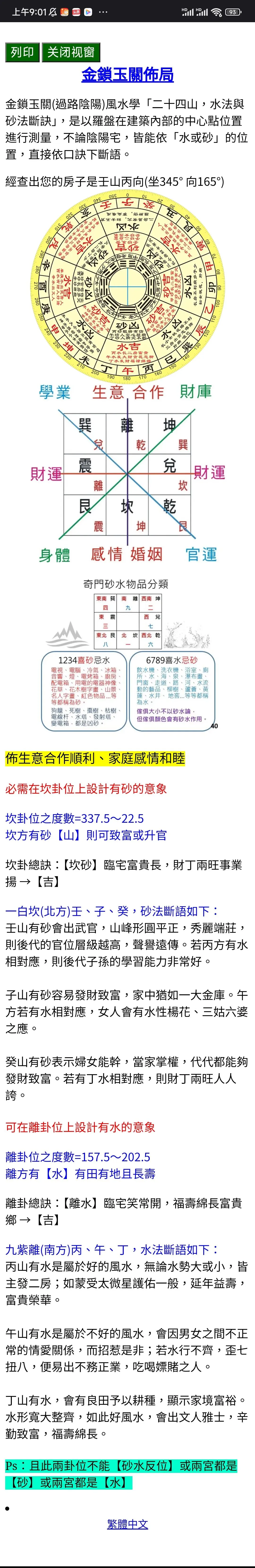 软件支持繁体和简体的字体转换,根据金锁玉关(过路阴阳)风水学「二十四山,水法与砂法断诀」,是以罗盘在建筑內部的中心点位置进行测量,不论阴阳宅,皆能依「水或砂」的位置,直接依口诀下断语。软件图文并茂直接提供24山砂水断语。另带玉关电子罗盘功能,支持立极尺户形图和卫星地图。具体包括以下功能: