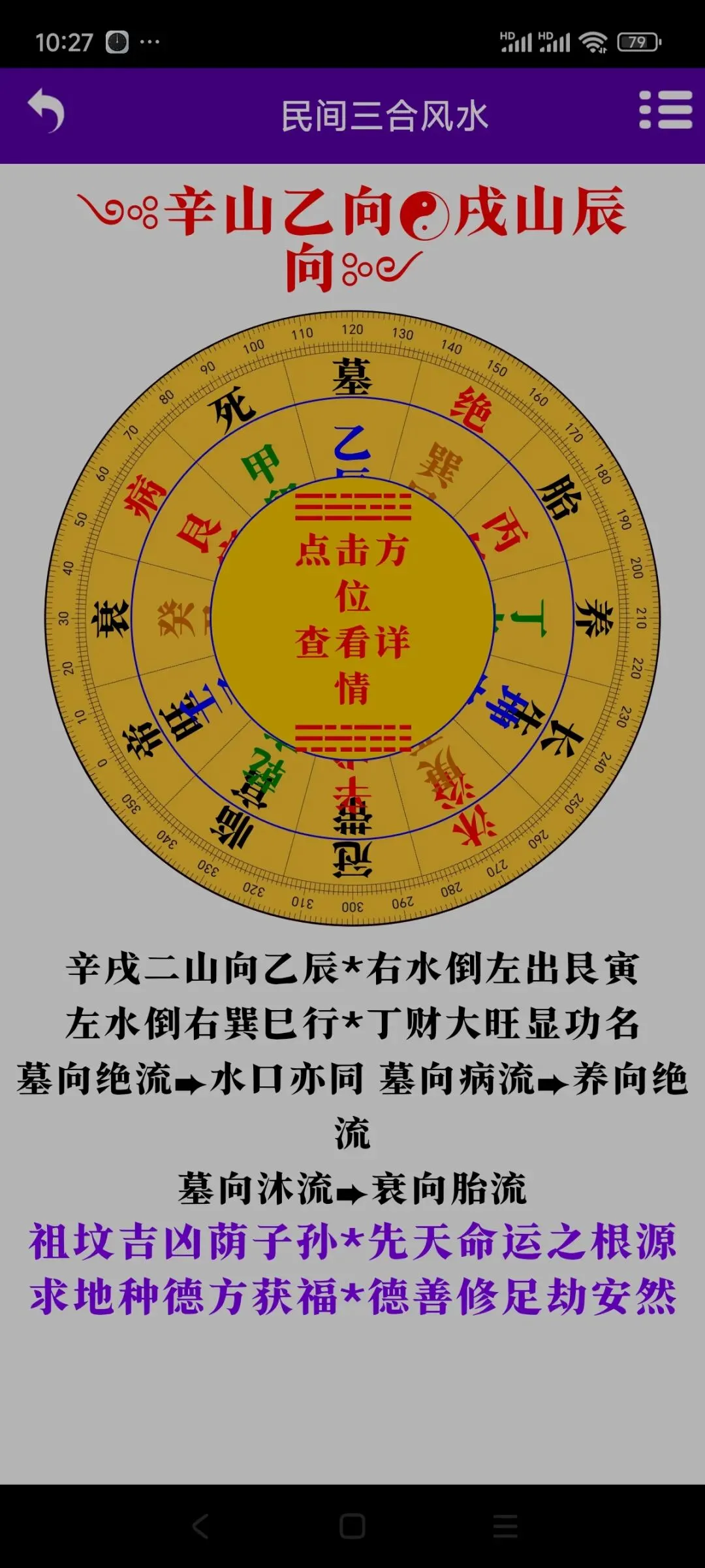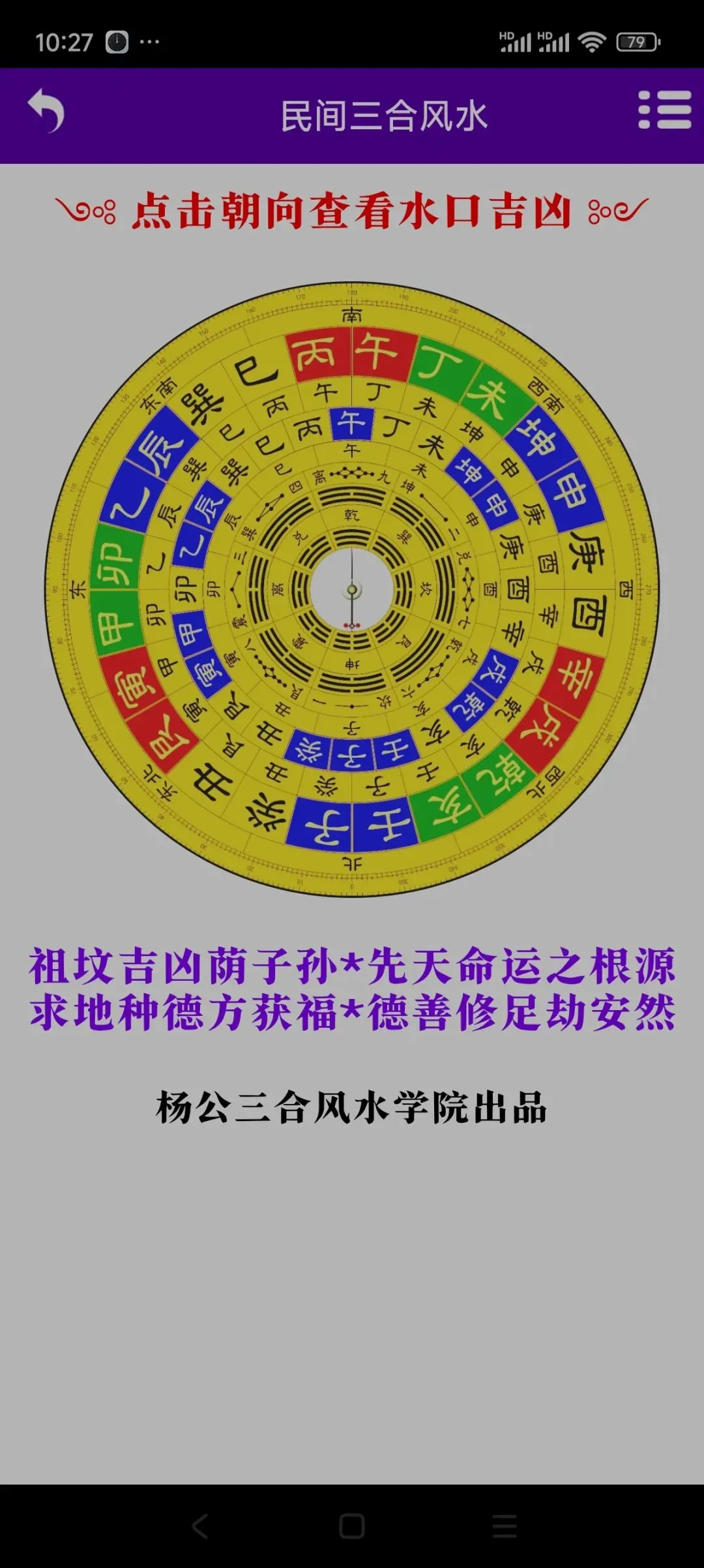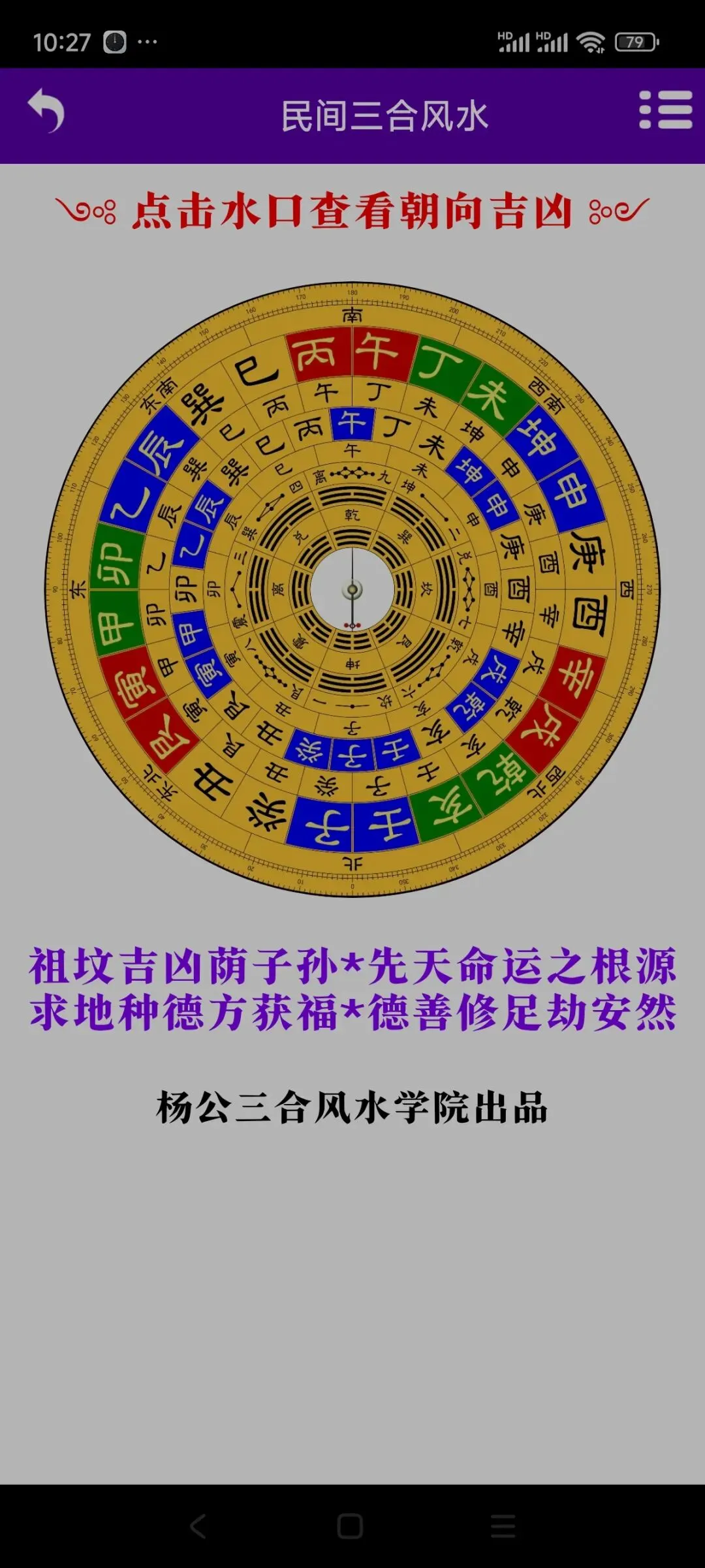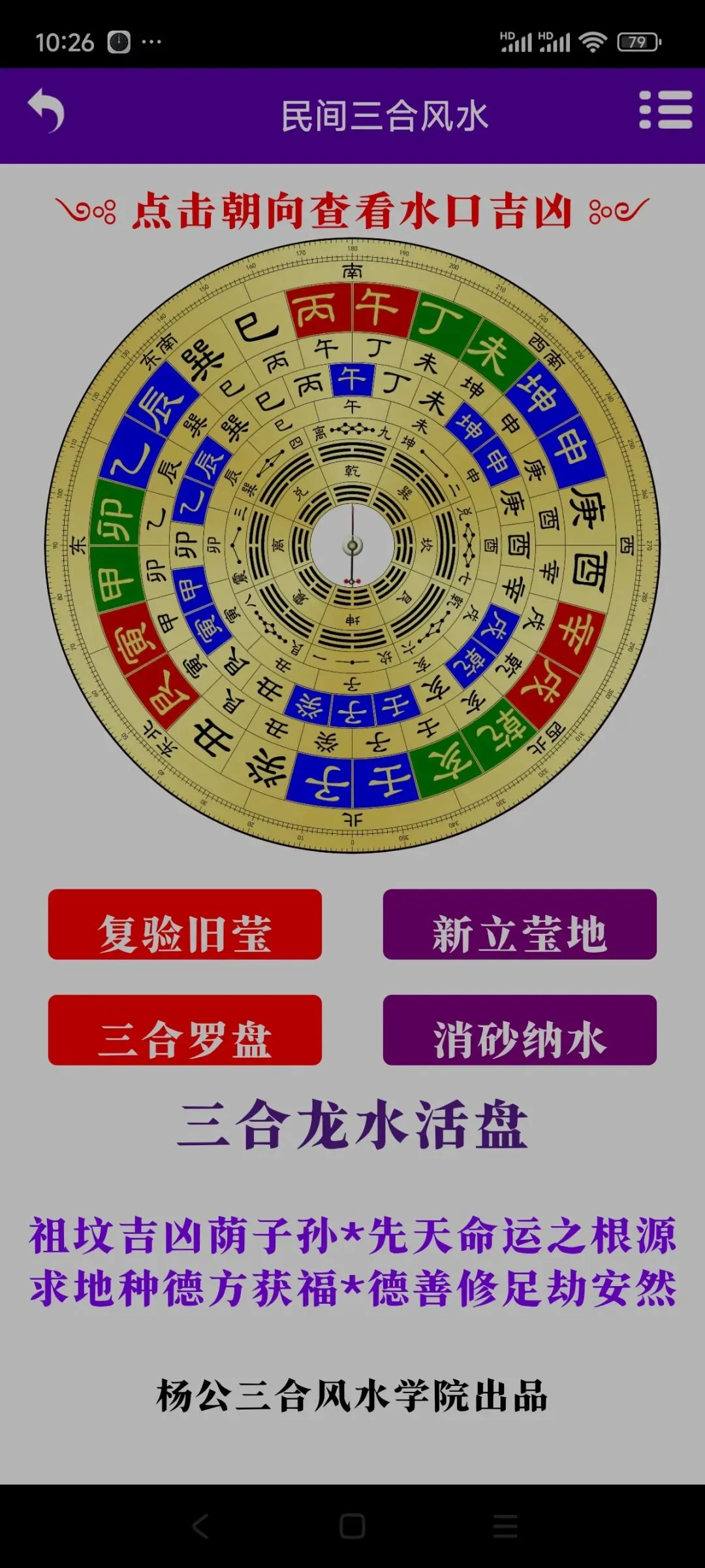 手机版杨公三合风水诀智能罗盘软件,卖80元.需要联系我,加微信yizheso手机版杨公三合风水诀智能罗盘软件,卖80元。需要联系我,加微信yizheso软件介绍:软件包括了以下内容①点击水口可以看水口吉凶②复验旧茔③新立茔地④三合罗盘(包括了四大局水口查询一⑤消砂纳水⑥三合龙水合盘