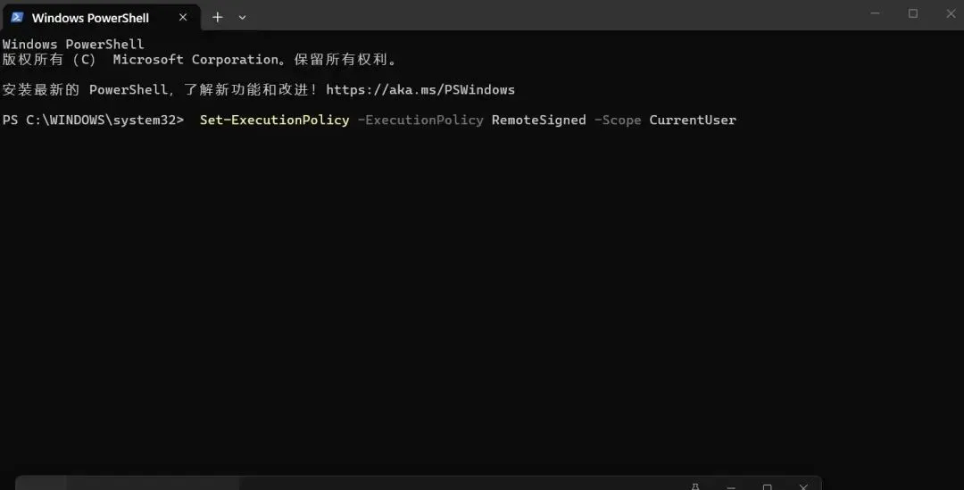 - 以管理员身份运行PowerShell,先输入命令 Set-ExecutionPolicy -ExecutionPolicy RemoteSigned -Scope CurrentUser 并回车,出现提示时输入“Y”确认。