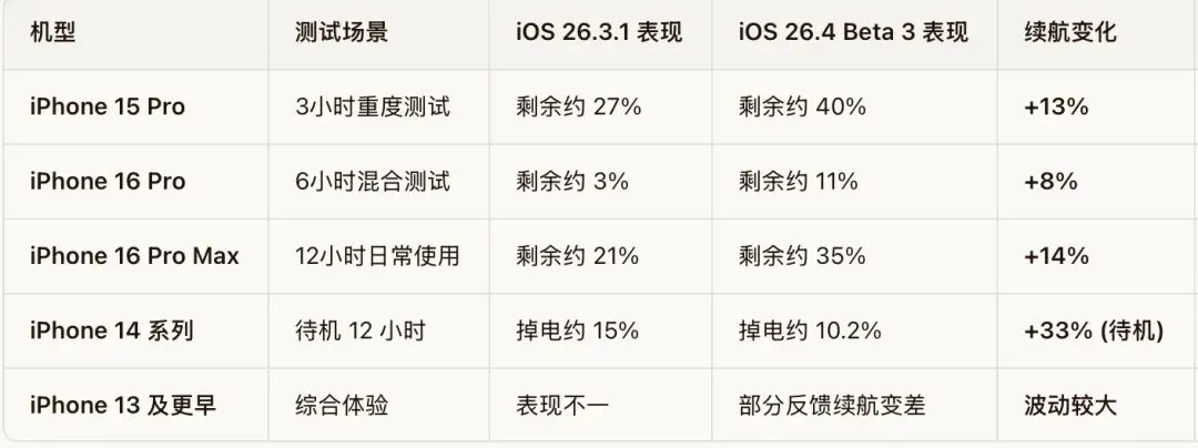 相比 iOS 26.3.1,26.4Beta 3 在续航优化上有所提升,iPhone 15/16/17 系列用户反馈普遍积极。