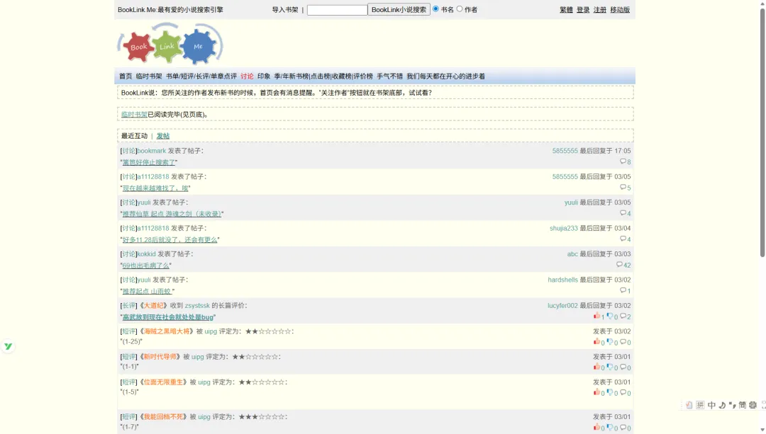 小说爱好者的互动社区,聚焦读者间的交流分享。主打小说推荐、长短评分享和找书交流,界面干净无冗余,用户可发帖互动、给小说星级打分,纯粹的读书交流平台。
