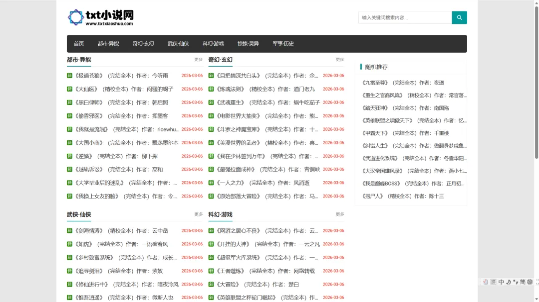 免费的TXT格式小说下载站,主打各类完结全本和精校版小说,按都市异能、奇幻玄幻、武侠仙侠等六大题材分类,覆盖网文主流类型。