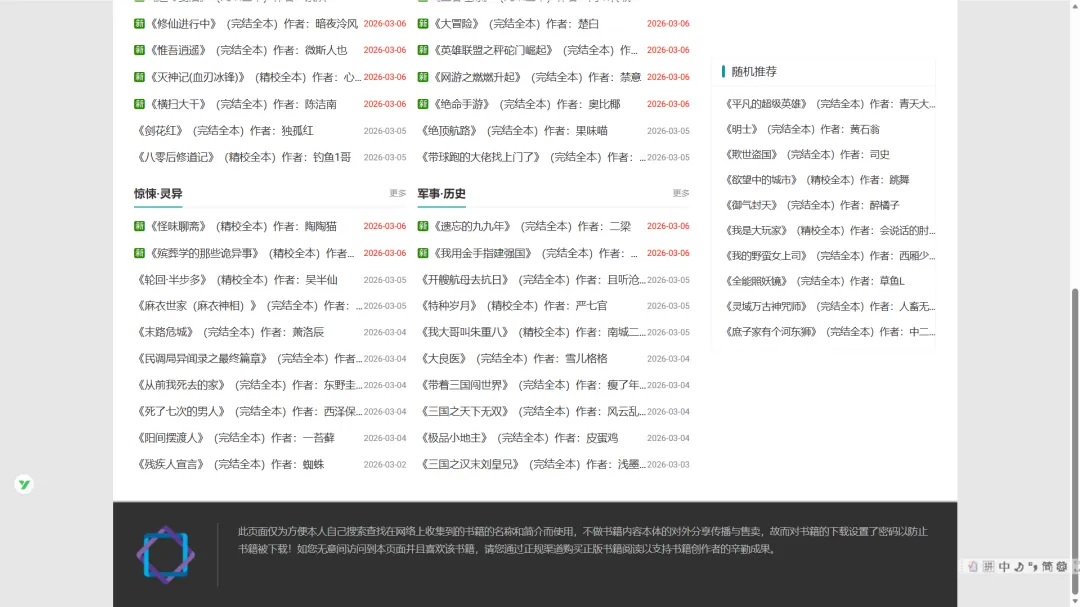 界面没有多余功能,直接按分类查找即可,小说信息直观、更新频率高,每天都会上新不同品类的完结小说。适合想一次性读完完整故事、不想追更的读者,找全本小说很方便。