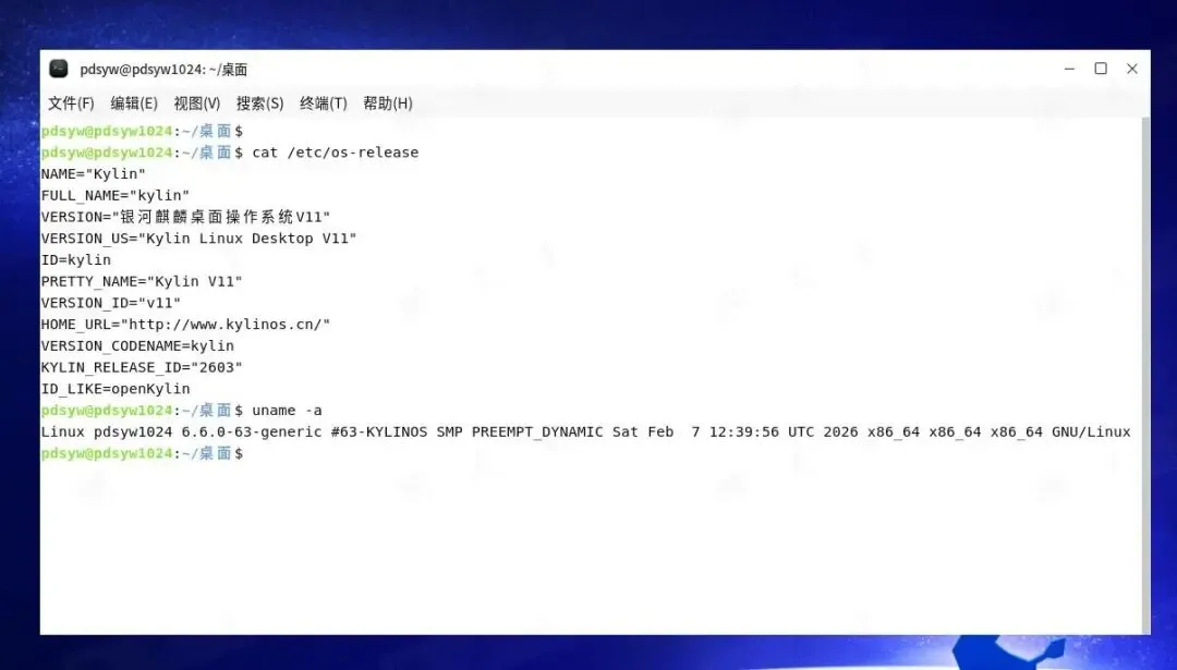 pdsyw@pdsyw1024:~/桌面$ cat /etc/os-releaseNAME="Kylin"FULL_NAME="kylin"VERSION="银河麒麟桌面操作系统V11"VERSION_US="Kylin Linux Desktop V11"ID=kylinPRETTY_NAME="Kylin V11"VERSION_ID="v11"HOME_URL="http://www.kylinos.cn/"VERSION_CODENAME=kylinKYLIN_RELEASE_ID="2603"ID_LIKE=openKylinpdsyw@pdsyw1024:~/桌面$ uname -aLinux pdsyw1024 6.6.0-63-generic #63-KYLINOS SMP PREEMPT_DYNAMIC Sat Feb 7 12:39:56 UTC 2026 x86_64 x86_64 x86_64 GNU/Linux