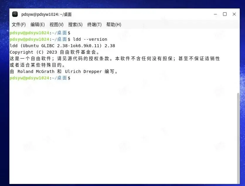 pdsyw@pdsyw1024:~/桌面$ ldd --versionldd (Ubuntu GLIBC 2.38-1ok6.9k0.11) 2.38Copyright (C) 2023 自由软件基金会。这是一个自由软件;请见源代码的授权条款。本软件不含任何没有担保;甚至不保证适销性或者适合某些特殊目的。由 Roland McGrath 和 Ulrich Drepper 编写。