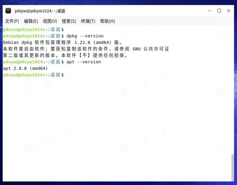 pdsyw@pdsyw1024:~/桌面$ dpkg --versionDebian dpkg 软件包管理程序 1.22.6 (amd64) 版。本软件是自由软件;要获知复制该软件的条件,请参阅 GNU 公共许可证第二版或其更新的版本。本软件【不】提供任何担保。pdsyw@pdsyw1024:~/桌面$ apt --versionapt 2.8.0 (amd64)