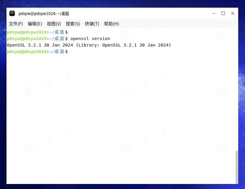 pdsyw@pdsyw1024:~/桌面$ openssl versionOpenSSL 3.2.1 30 Jan 2024 (Library: OpenSSL 3.2.1 30 Jan 2024)