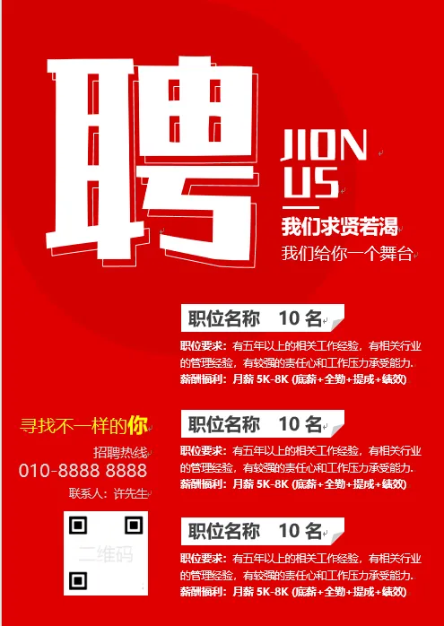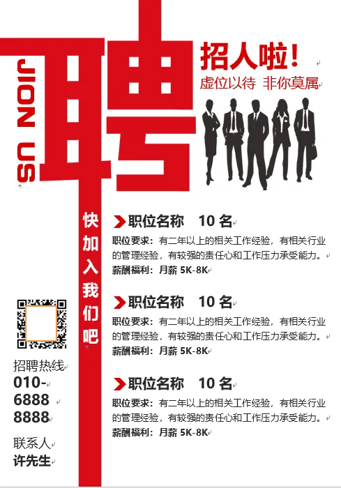 公司招聘海报企业工厂用人单位宣传广告Word模板素材公司招聘海报企业工厂用人单位宣传广告Word模板素材,部分效果预览如下,完整版下载方式见文末。详细资料下载地址:(手机端请长按下方二维码识别,电脑端请用手机微信扫描识别)