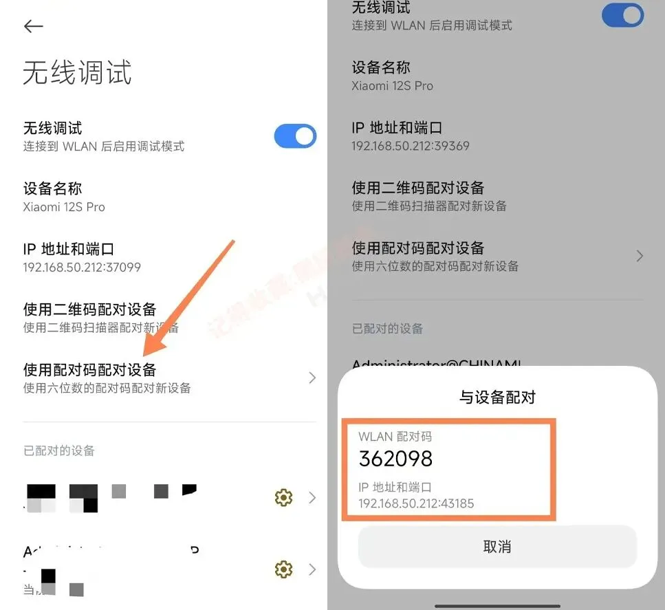 如果是无线的,需要填写手机端的IP地址、端口和配对码,这些数据在手机的“无线调试”处有显示。
