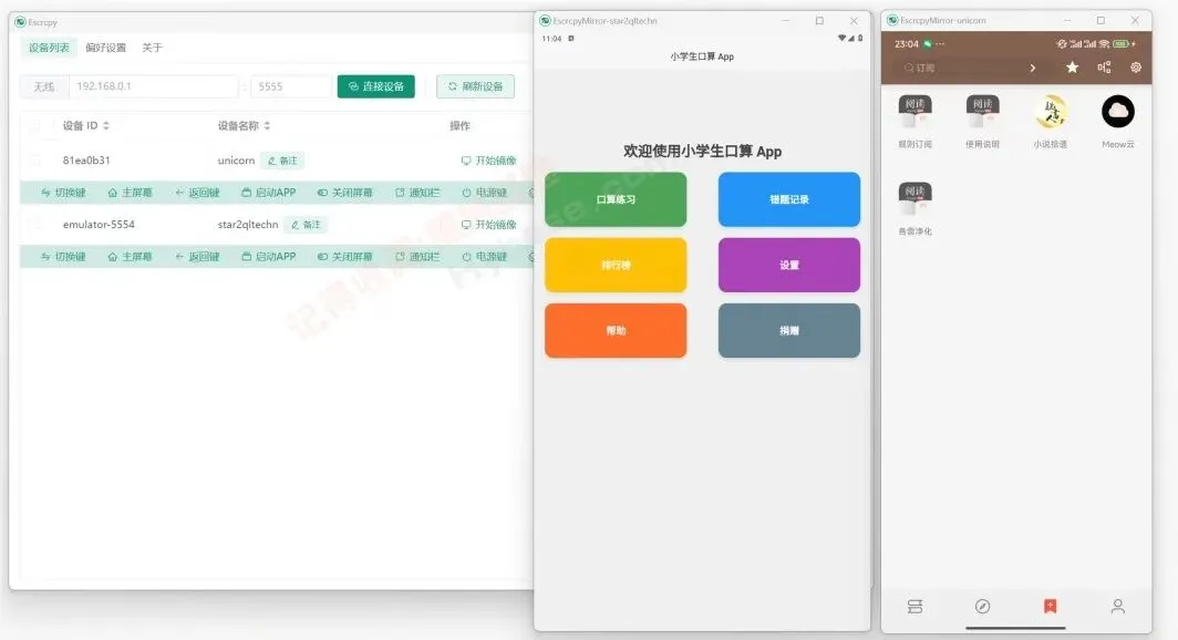 通过有线或者无线连接到Escrcpy后,可以同时在电脑端里显示多部手机设备的连接,便于我们操作。