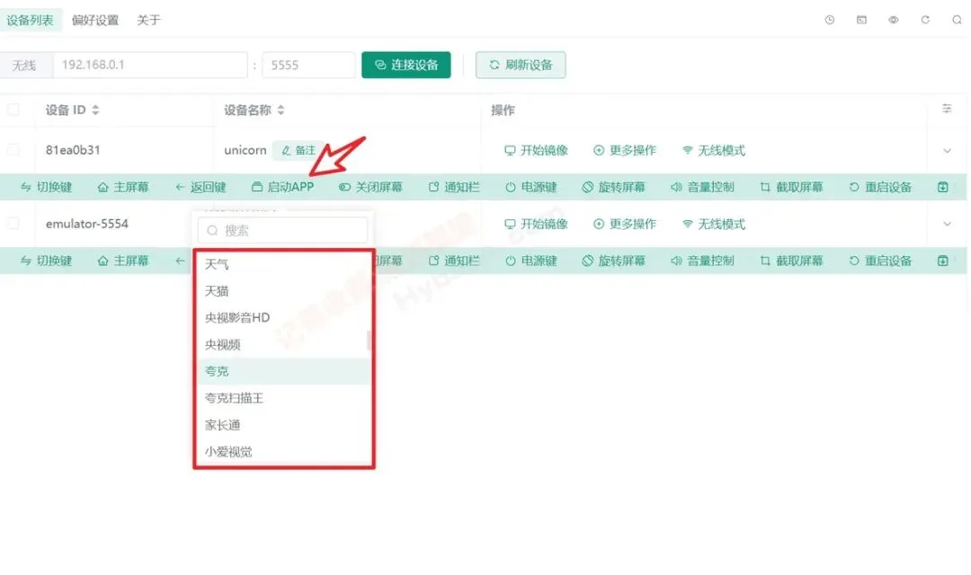 3.Escrcpy 设备列表应该检测到手机,点击开始镜像。