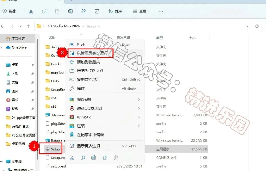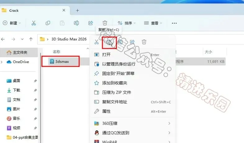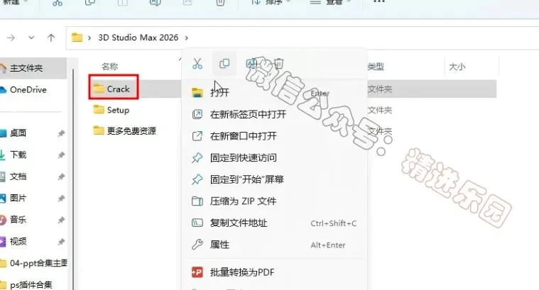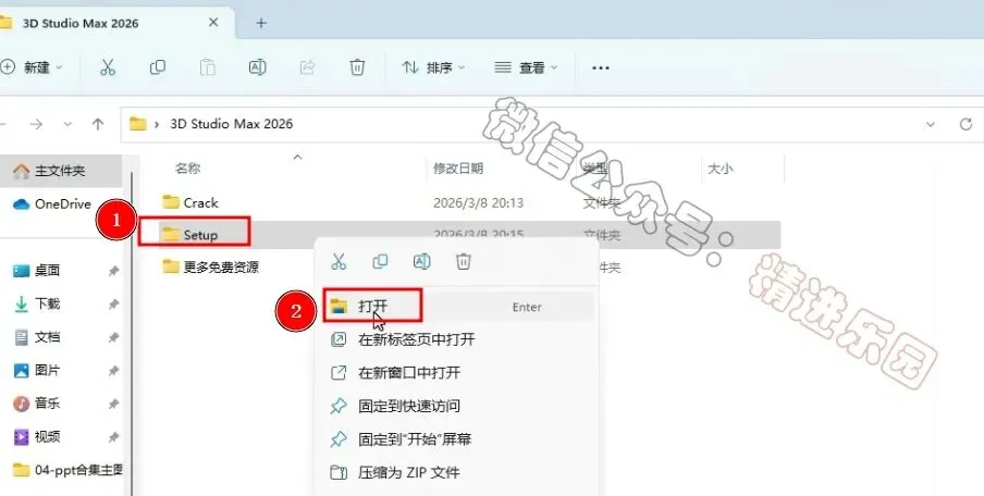 1、下载3D Studio Max 2026软件安装包到电脑上,右键选择【解压到当前文件夹】2、找到【Setup】文件夹,右键【打开】它3、找到【Setup】应用程序,右键选择【以管理员身份运行】它4、勾选【我同意】,再点击【下一步】5、可自定义更改软件安装位置,这里小编选择默认安装在C盘;点击【下一步】6、点击【安装】7、软件安装中,稍等片刻8、软件安装成功,点击右上角【关闭按钮】9、回到3D Studio Max 2026文件夹,找到【Crack】文件夹,右键【打开】它10、选中【3dsmax】文件,再右键点击【复制按钮】11、回到桌面,右键桌面上的【3ds Max 2026软件图标】,点击【打开文件所在的位置12、右键文件夹的空白处,点击【粘贴按钮】13、点击【替换目标中的文件】14、点击“开始“菜单栏,点击“所有应用“,找到“3ds Max 2026....“软件,将软件图标拖到桌面上,完成软件桌面快捷方式的创建15、回到桌面,右键桌面上的【3ds Max 2026软件图标】,点击【打开】16、软件正在打开,启动界面如下:17、软件打开成功,运行界面如下: