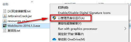 2.选中WebStorm-2016.1.3,鼠标右击选择“以管理员身份运行”