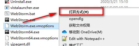 12.在该目录下找到webstorm.exe.vmoptions,鼠标右键选择“打开方式”