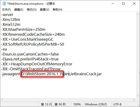 16.在文档的尾部加上:-javaagent:D:\WebStrom 2016.1.3\bin\JetbrainsCrack.jar。其中【D:\WebStrom 2016.1.3】是软件的安装目录(第4步设置的路径),然后按下快捷键Ctrl+S保存该文档