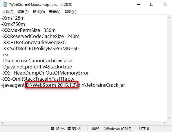 14.在文档的尾部加上:-javaagent:D:\WebStrom 2016.1.3\bin\JetbrainsCrack.jar。其中【D:\WebStrom 2016.1.3】是软件的安装目录(第4步设置的路径),然后按下快捷键Ctrl+S保存该文档