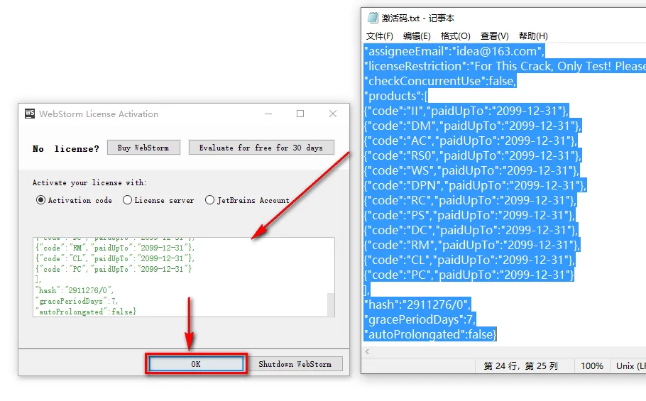 21.将激活码全部复制并粘贴到Activation code对话框内,点击“OK”