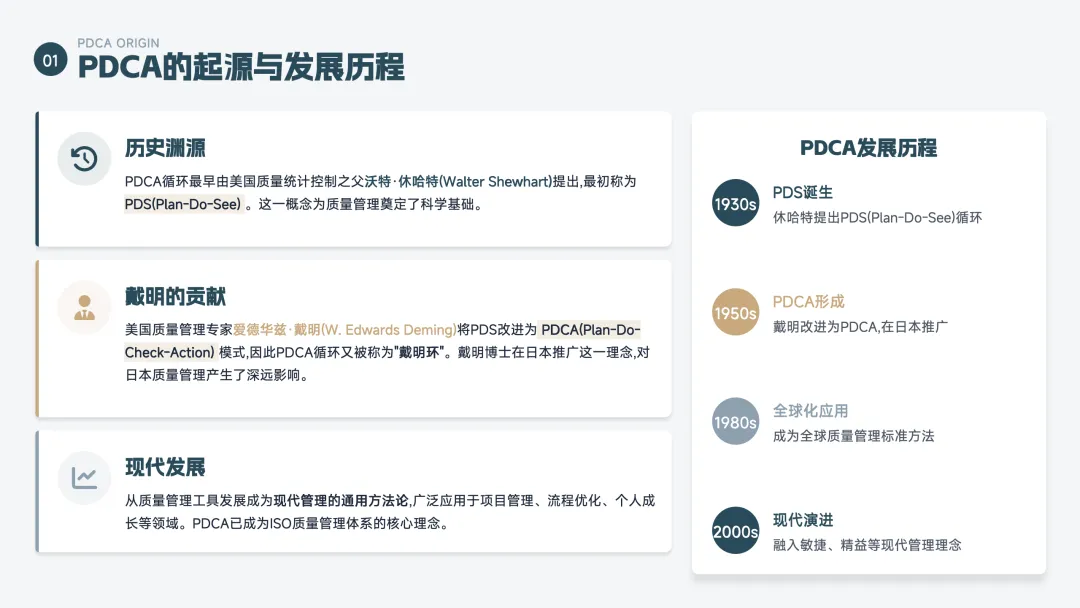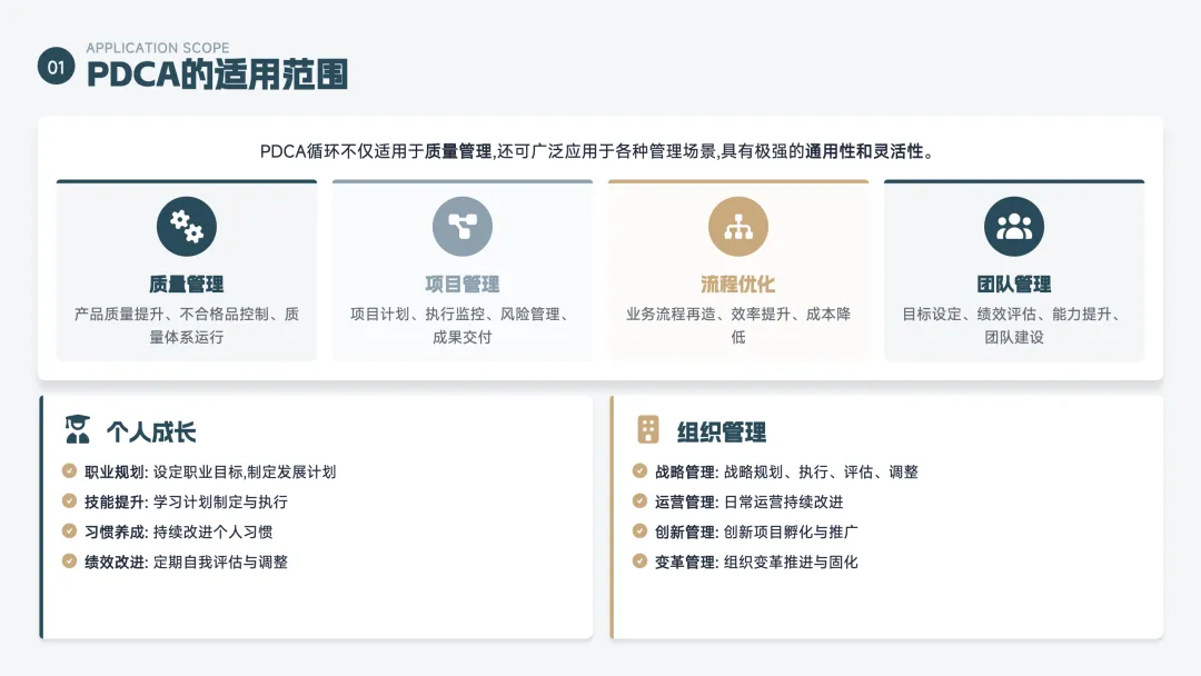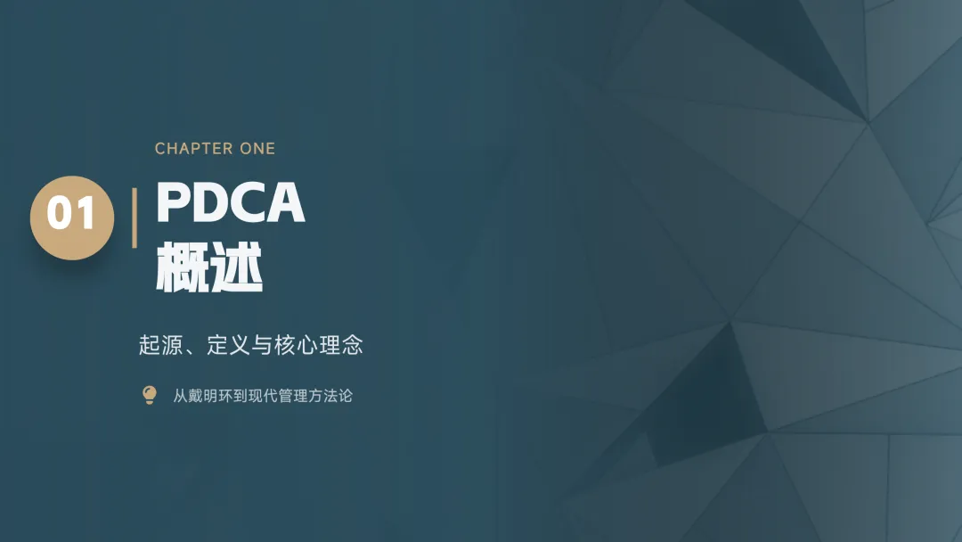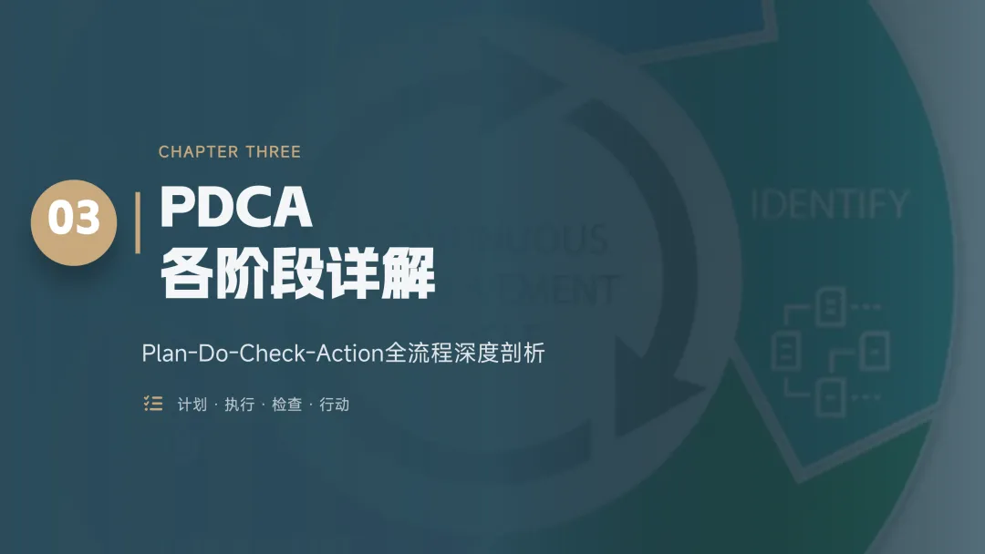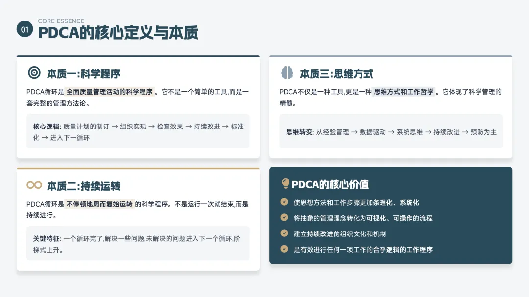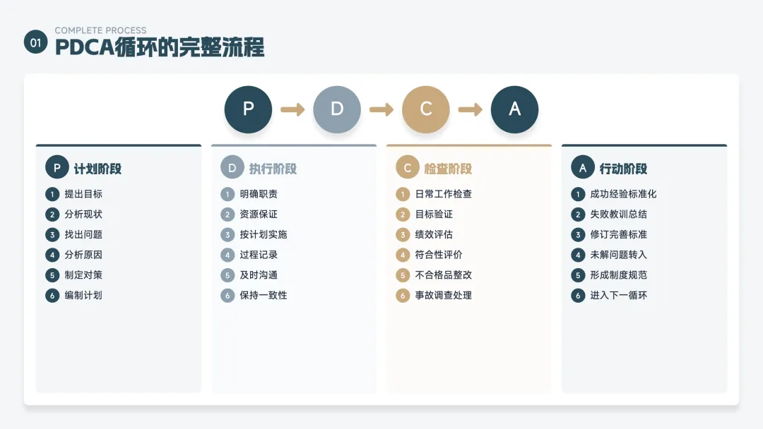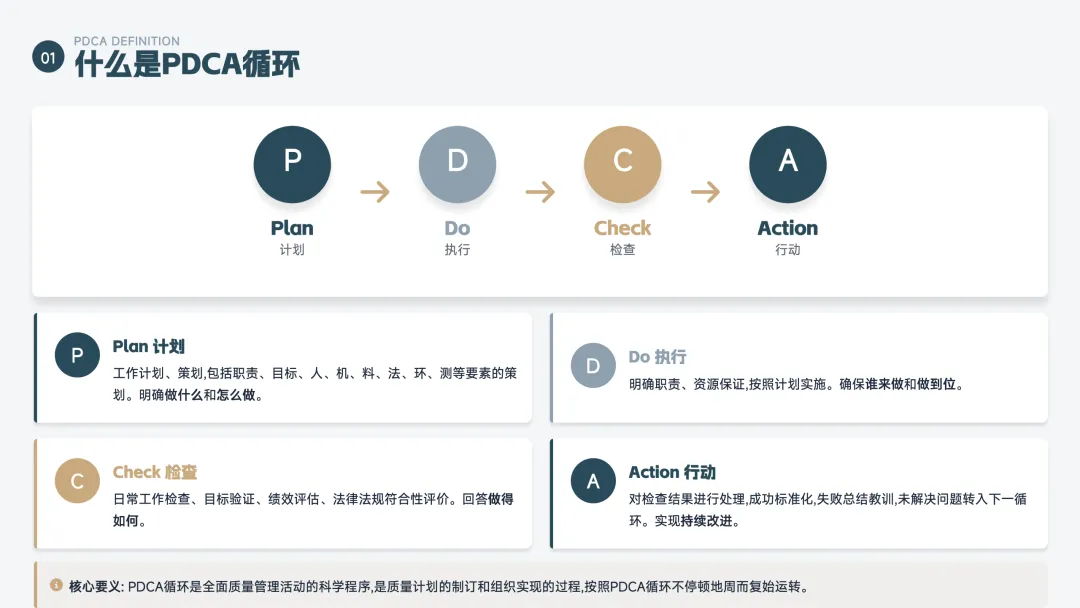PDCA 是一个持续改进的循环方法,也叫"戴明环",分为四步: