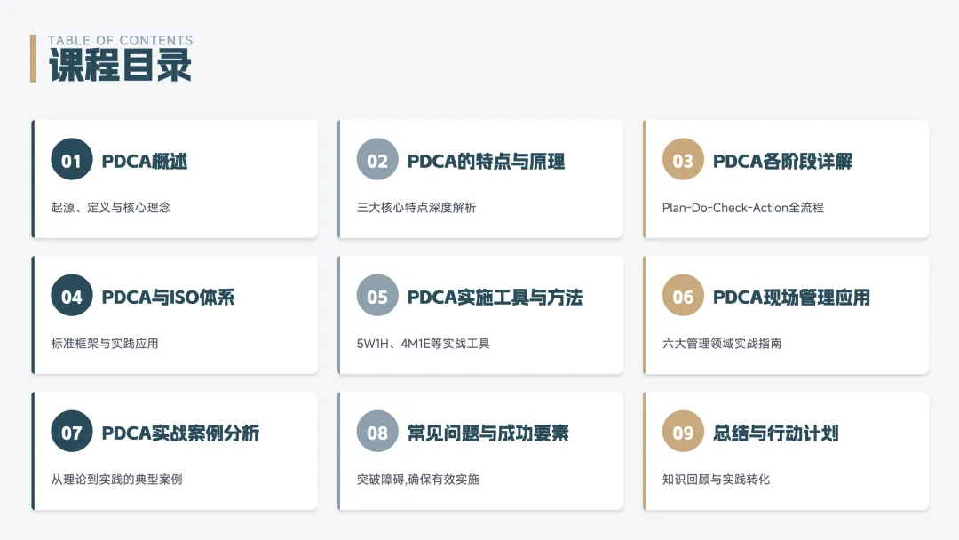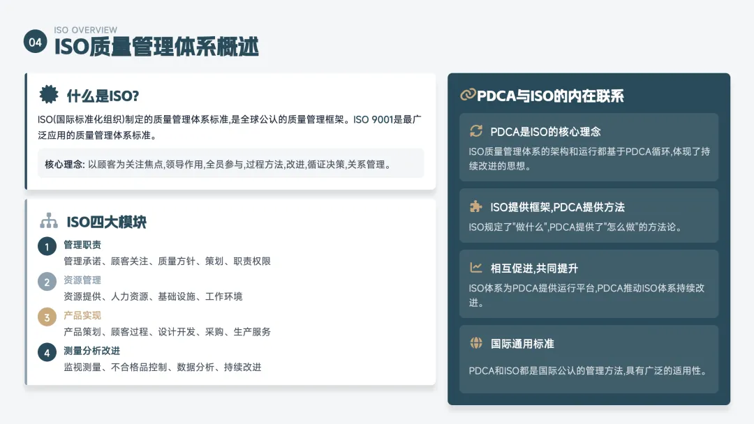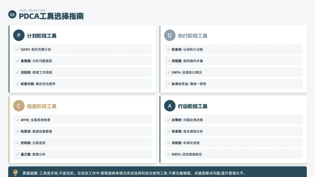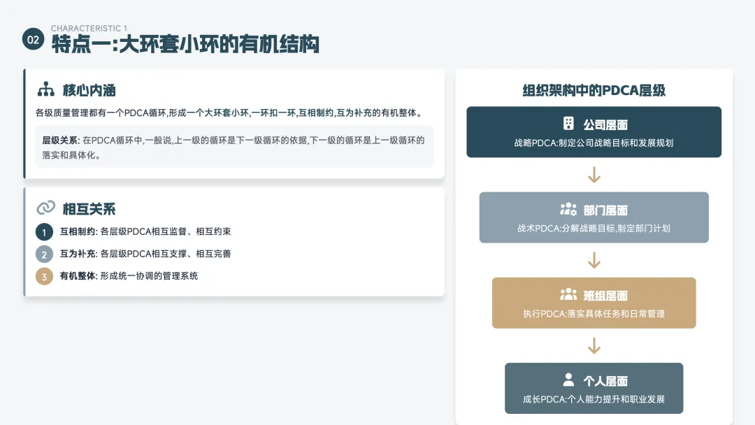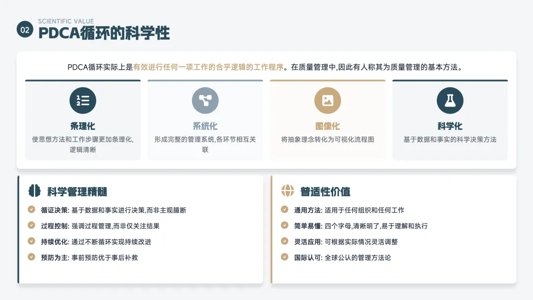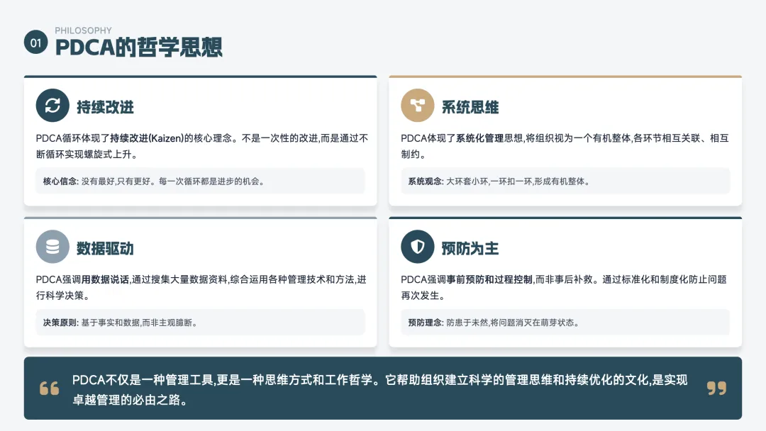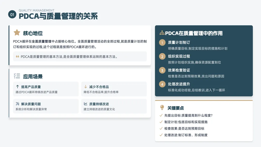 PDCA 是一个持续改进的循环方法,也叫"戴明环",分为四步: