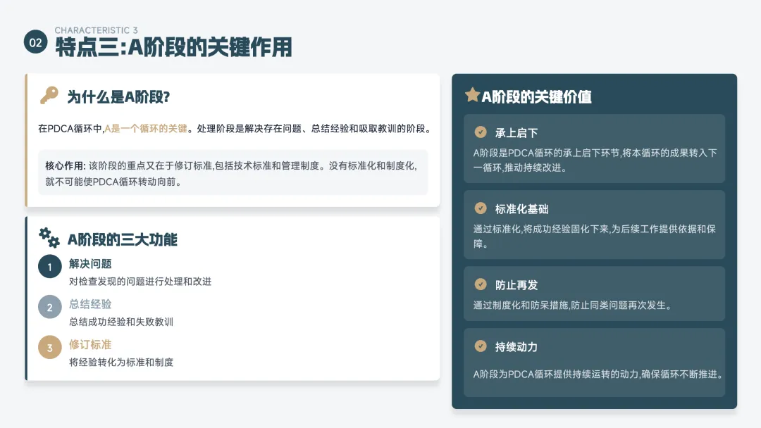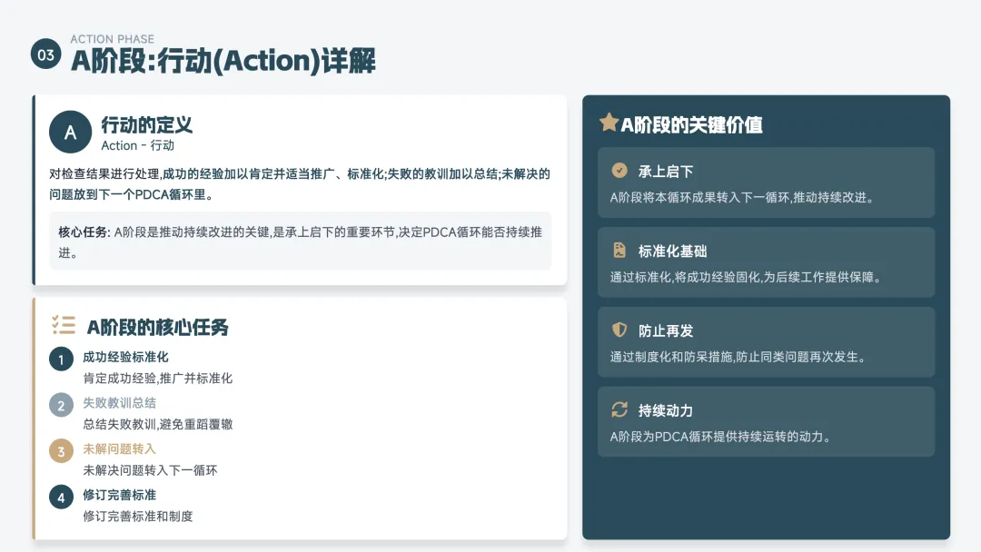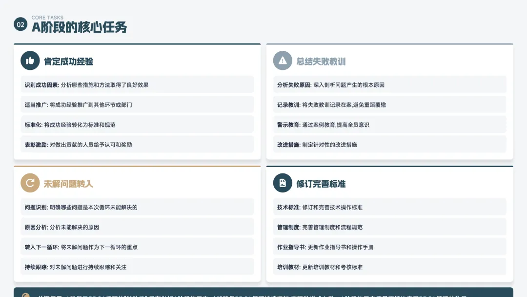 A(Act 处理) —— 总结经验,标准化或改进