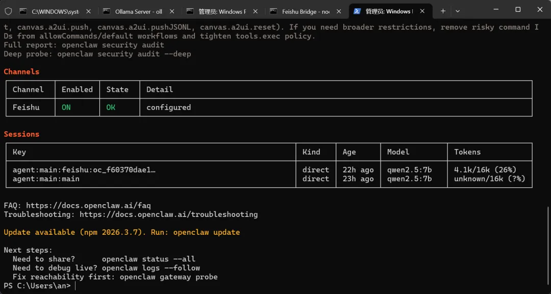 • 重启网关: openclaw gateway restart• 检查状态: openclaw gateway status• 更新: openclaw update --channel stable• 诊断: openclaw doctor• 卸载: openclaw uninstall