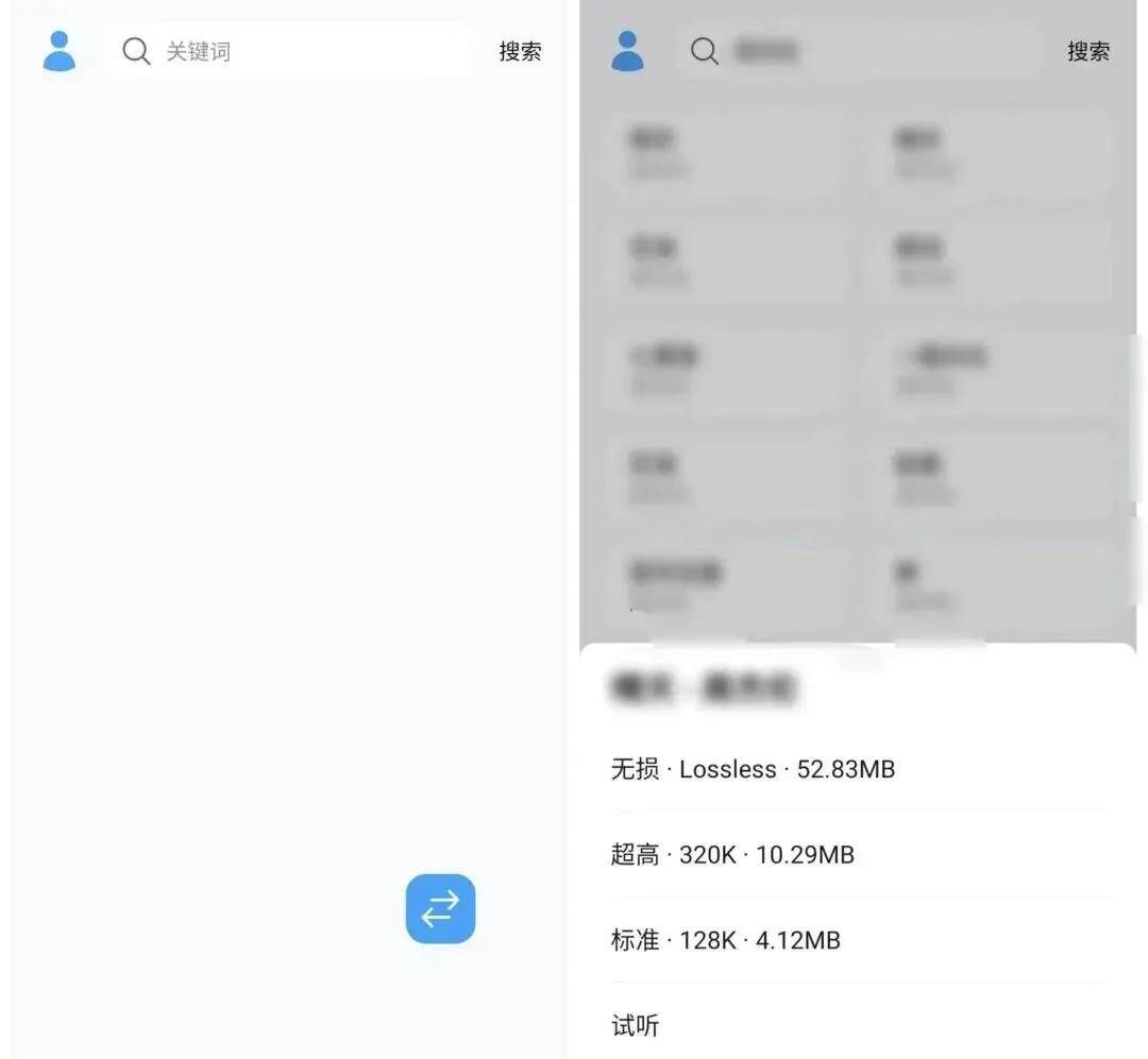 一款免费的音乐播放下载器,最高支持免费下载无损音质,UI简洁美观,没有花里胡哨的东西。首页只有一个搜索框和切换引擎图标,想听/下什么直接搜索即可。