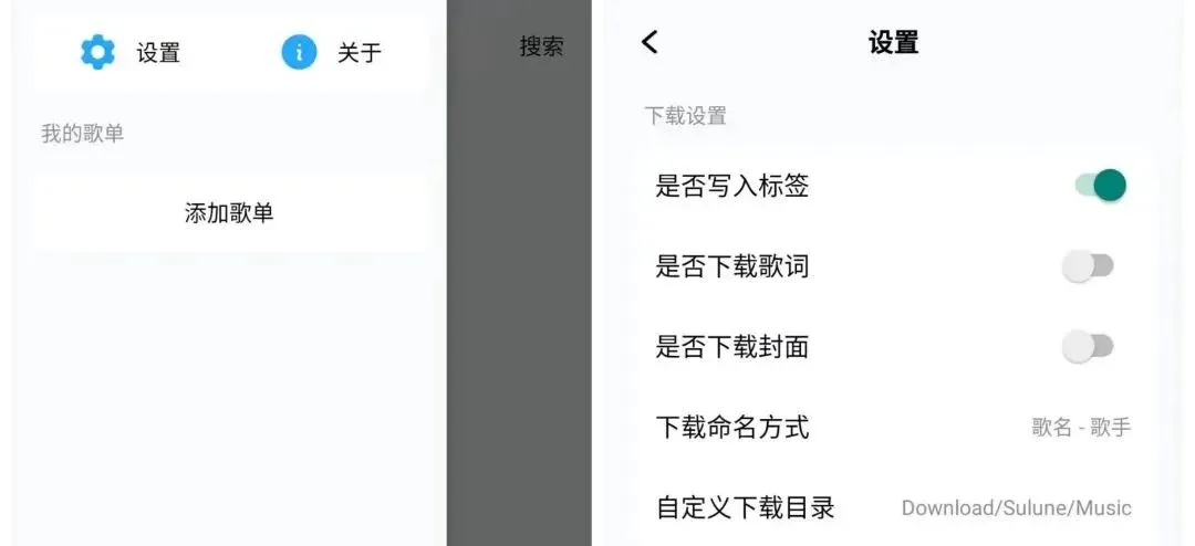 搜索到的结果点击即可在线播放/下载,最高支持免费下载无损音质,没有任何的套路。点击主页右上角"小人"里面可以设置,下载目录、是否下载歌词、封面