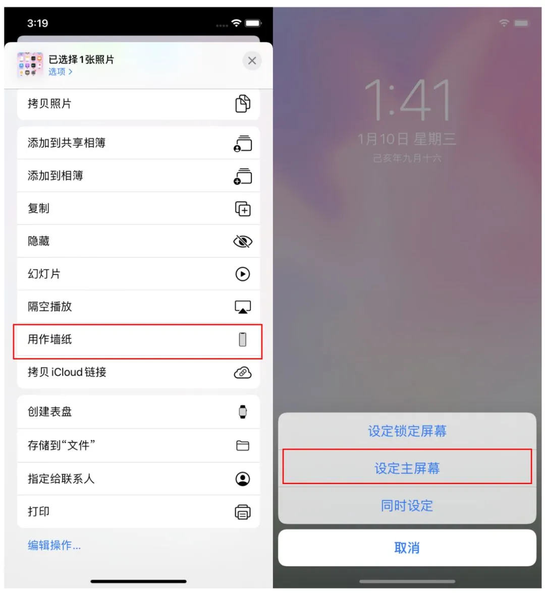 同样将壁纸保存至「照片」,在相册打开点击左下角「分享」,选择「用作墙纸」然后在「设置」-「通用」-「辅助功能」中,使用深色的壁纸就打开「降低透明度」,使用浅色的壁纸就关闭「降低透明度」,即可隐藏主屏幕 Dock 栏。