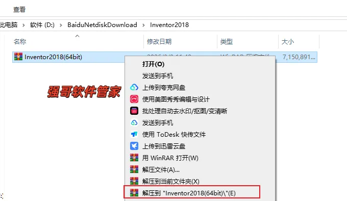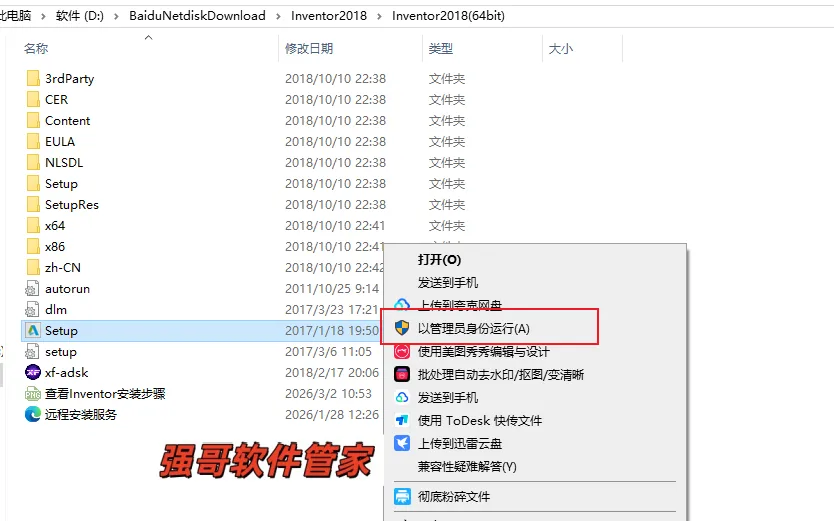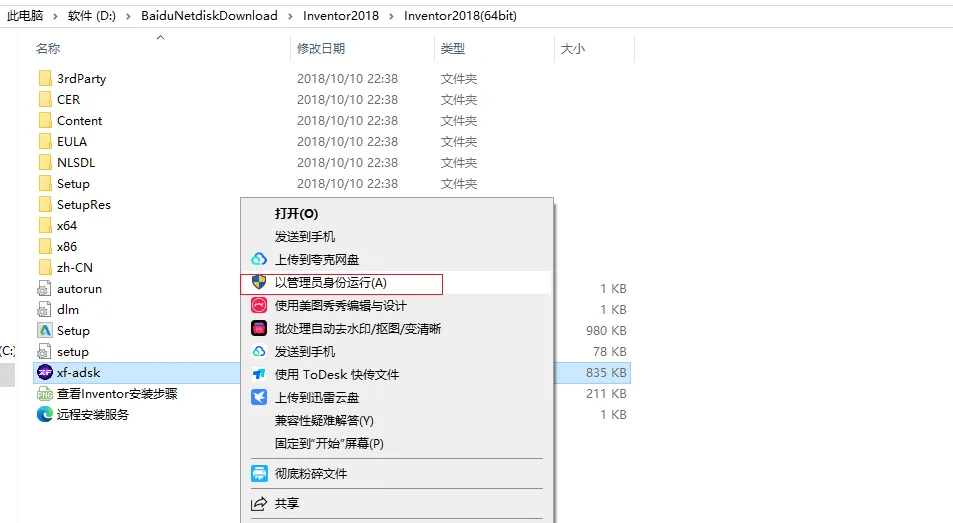 17.打开安装包解压后的【Inventor2018】文件夹,鼠标右击【xf-adesk】选择【以管理员身份运行】